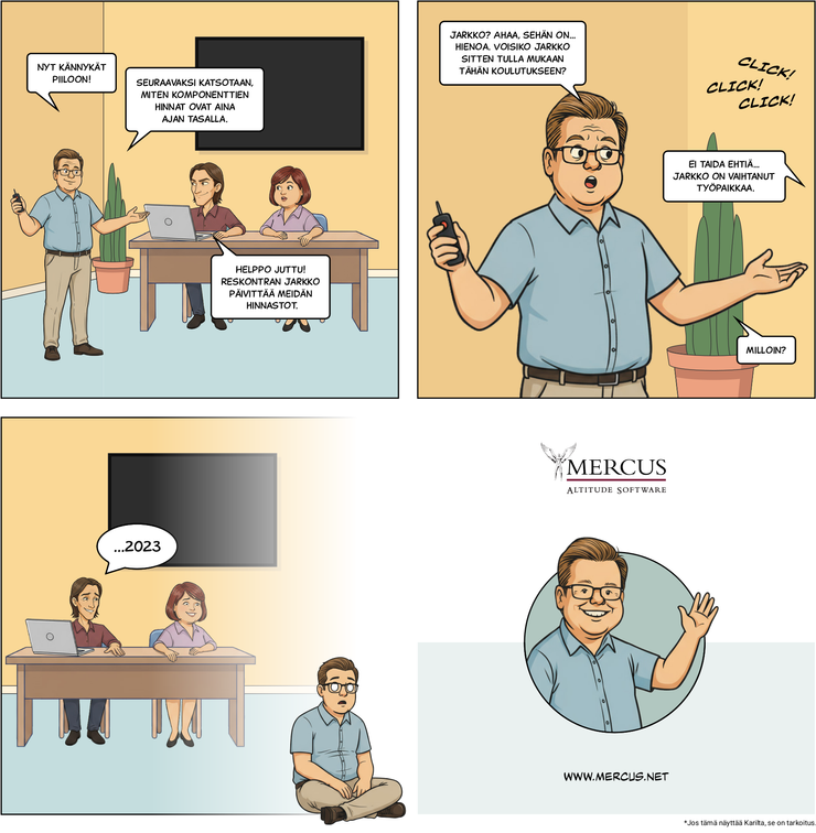 Tämänkin mielikuvituksellisen tarinan takana on – uskokaa tai älkää – tosielämän tapaus. Eräs Brokerin tarjouslaskennan vahvoja ja arvokkaimpia ominaisuuksia on hinnastojen automaattinen päivitys. Siksi sen käyttöönotto varmistetaan aina koulutuksissa, jotta kenenkään ei tarvitsi laskea yhtään tarjousta väärillä hinnoilla.